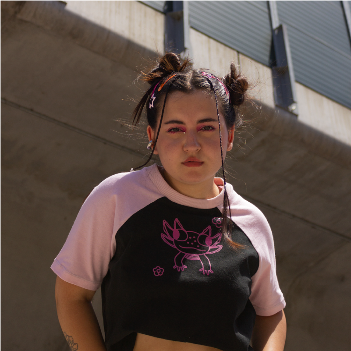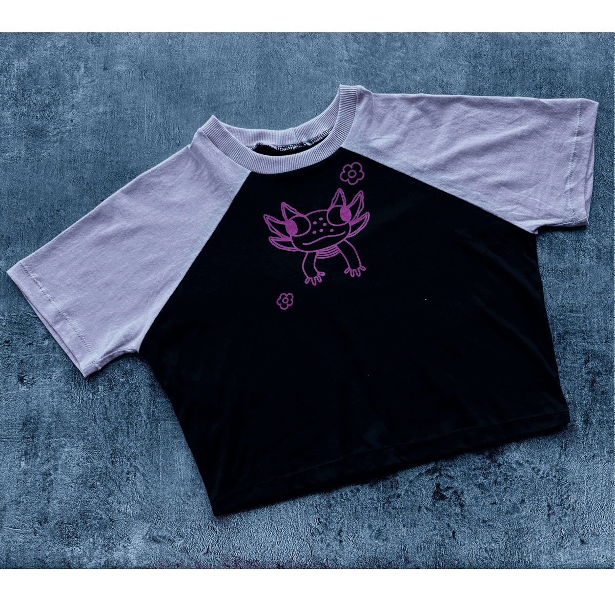 Remera baby tee de algodón con calce cómodo y mangas en contraste. Estampa original de ajolote en tinta vibrante, ideal para looks urbanos con un toque lúdico y alternativo.