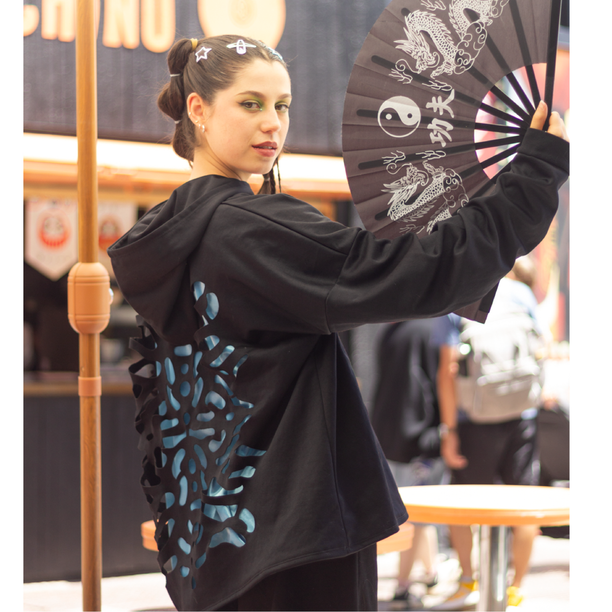 El calado en la espalda deja ver una capa interna en contraste, generando profundidad y un efecto visual inesperado. En el frente, la estampa DTF aporta definición y durabilidad, sumando identidad sin perder versatilidad.
