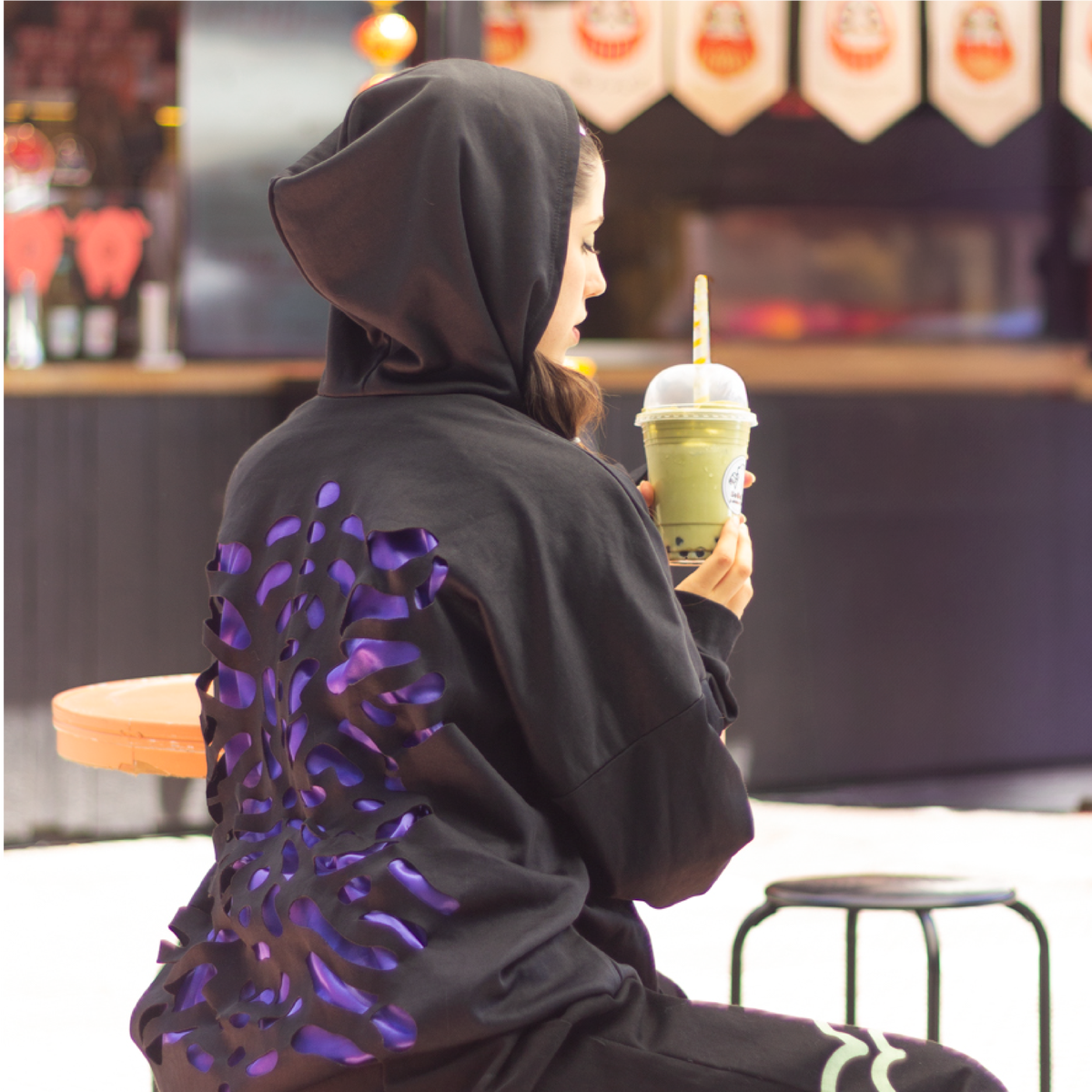 El calado en la espalda deja ver una capa interna en contraste, generando profundidad y un efecto visual inesperado. En el frente, la estampa DTF aporta definición y durabilidad, sumando identidad sin perder versatilidad.
